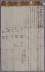 所志 68 1842(憲宗8) 103×59 囚獄罪人辛齡奎 右謹言誠惶誠恐敢呼疾痛之情仰訴於 城主父母之下爲去乎伏乞 細細垂察焉民自去年三月以後爲族人辛復鉉等之誣訴民之老父累度杖囚之餘幸蒙 城主公決之」 澤旣爲決案成給是白乎厼[旀]且辛復鉉等六朔呈訴每每稱以爲先是如及其捧錢百兩之無一字文爲先之 -