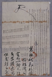 所志 100 1846(憲宗12) 62×40 靈光化民辛恒𢢜辛恒彦辛{山/(宏-宀)}珪等」 右謹言情由事向日良中民等之七代祖丁卯之亂湖南募義首倡功臣掌令公墓直烟戶減役事齊聲仰籲則 題音內烟戶頉役亦非自官率爾擅行事」 行下是乎所民等旣奉 題音今且更瀆極爲惶悚是乎乃然有官爵與忠賢墓直之減役乃是 -