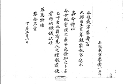忝親載寧李壽一再拜. 忝親載寧李壽一白, 大興白生員尊親家執事, 伏承 嘉命, 許以 令女, 貺室僕之長子元發, 加之卜占, 已叶吉兆, 玆有先人之禮, 敬遣使 者, 行納徵儀, 伏惟 尊慈, 特賜 鑒念, 不宣. 丁亥二月八日. G002+AKS+KSM-XF.1827.0000-201010 -