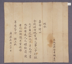 고문서-서간통고류-혼서 종교·풍속-관혼상제-혼서 43책 안동 갈전 순흥안씨 종가편-고문서-서간통고류-혼서 1760년 안정서(安井瑞) 혼서(婚書) 안정서 1760 낱장 1장 종이 한자 43 고문서 6. 서간통고류 (4) 혼서 혼서 혼서 4 449 043_0343 출판 -